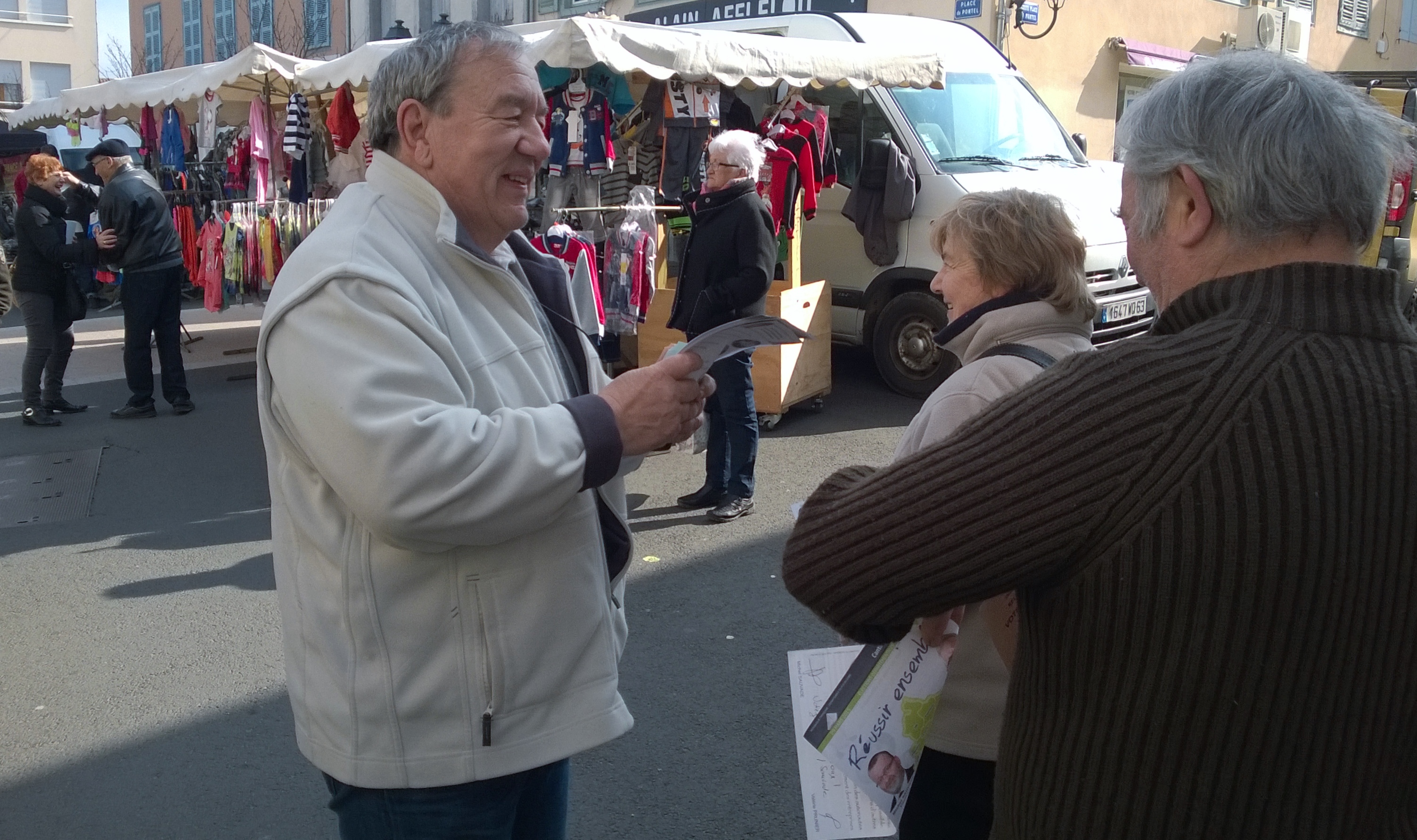 0-marchéJe pense que je n’ai jamais pris autant de plaisir à tracter sur un marché durant une campagne électorale qu’aujourd’hui. Soleil dans le ciel, parfum d’enthousiasme dans les rues, nombreux encouragements pour la dizaine de membres de l’équipe de campagne présents.